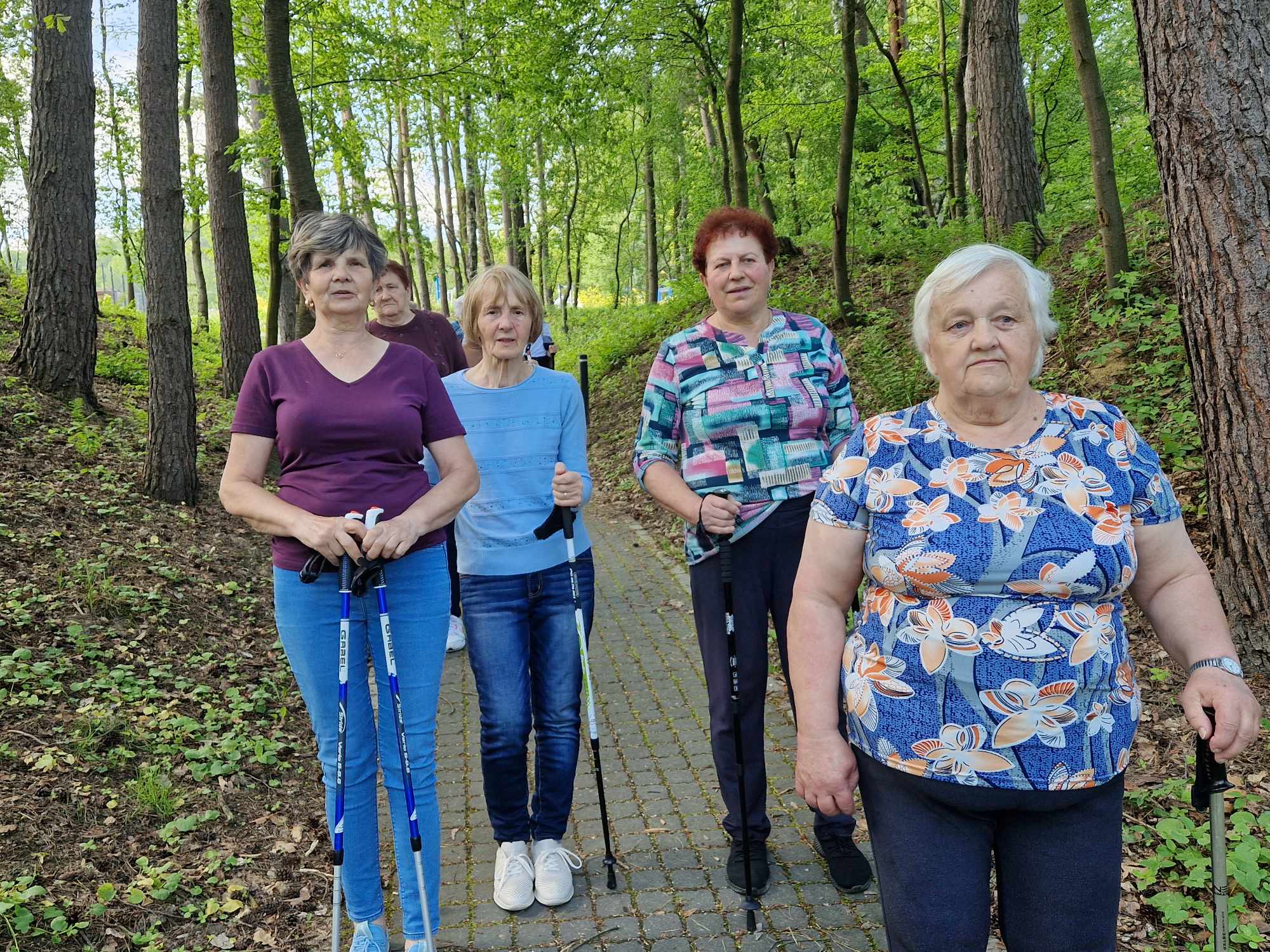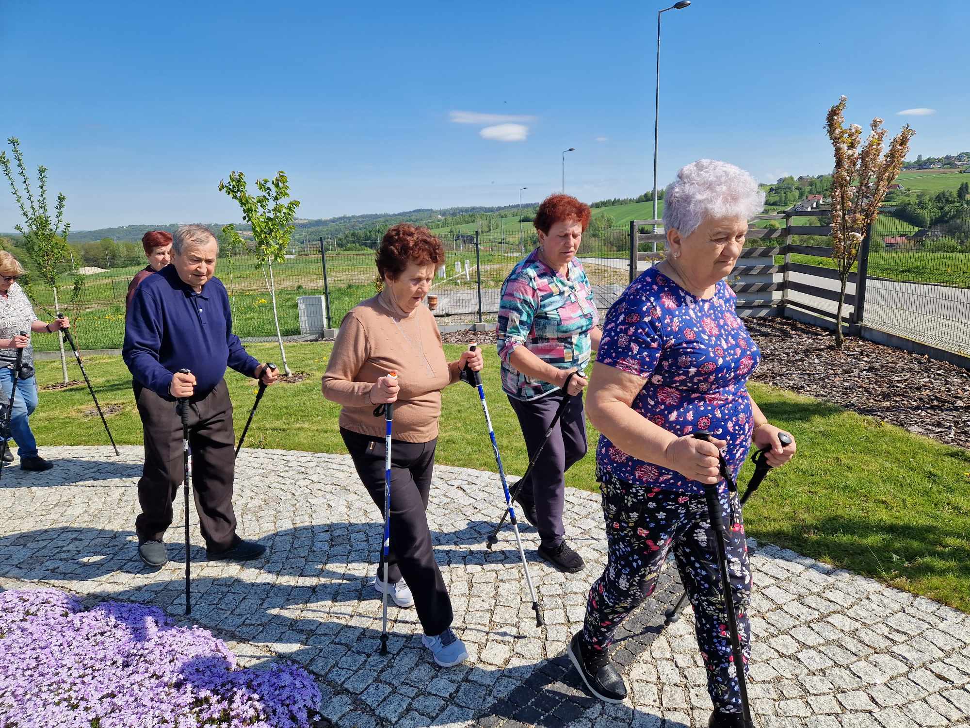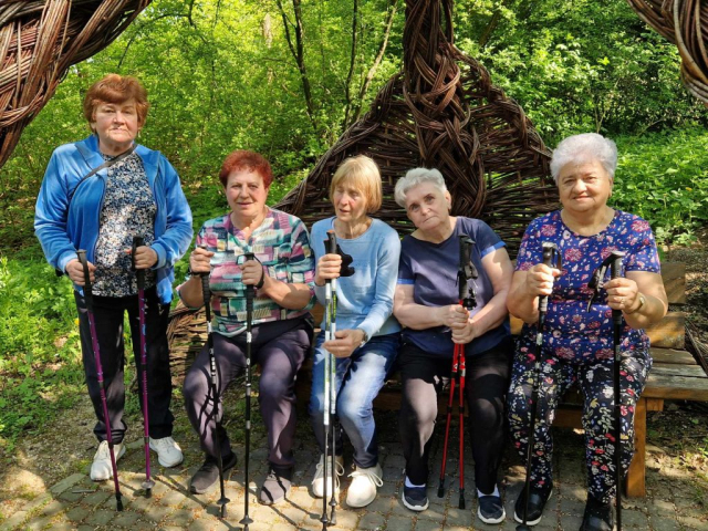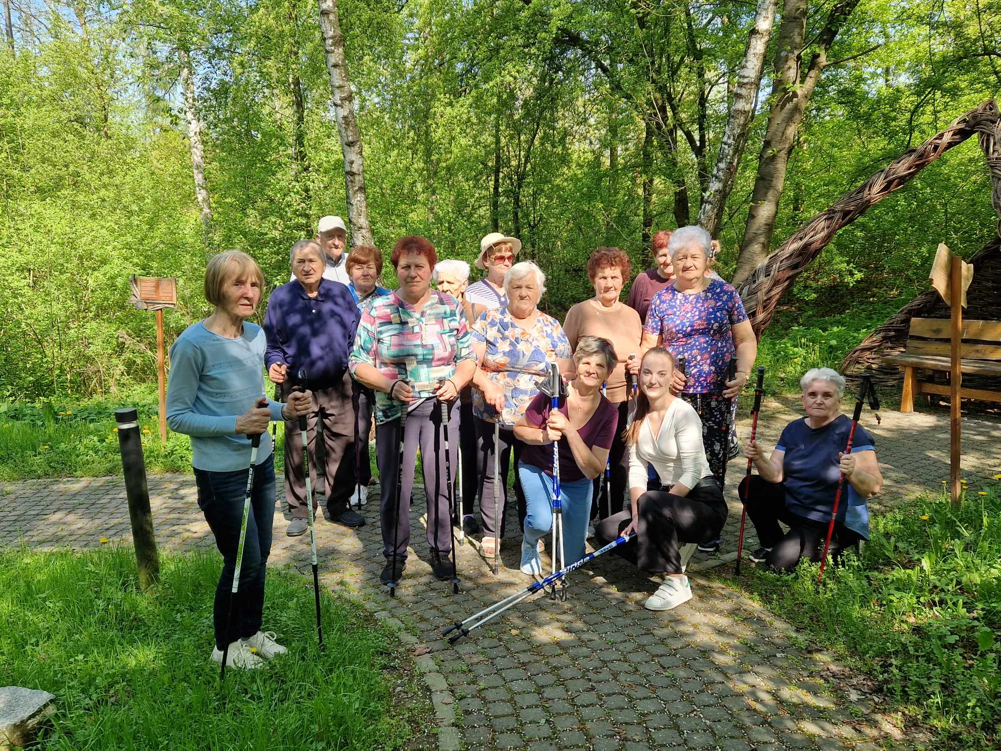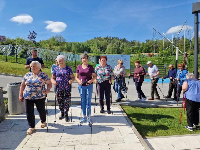 Seniorzy wraz z instruktorem Panią Bożeną Mastalską wybrali się na spacer po obiekcie. W czasie wędrówki podopieczni korzystali z specjalistycznych kijków Nordic Walking, które posiadają wiele zdrowotnych zalet np. odciążają kręgosłup i stawy. ![]()
